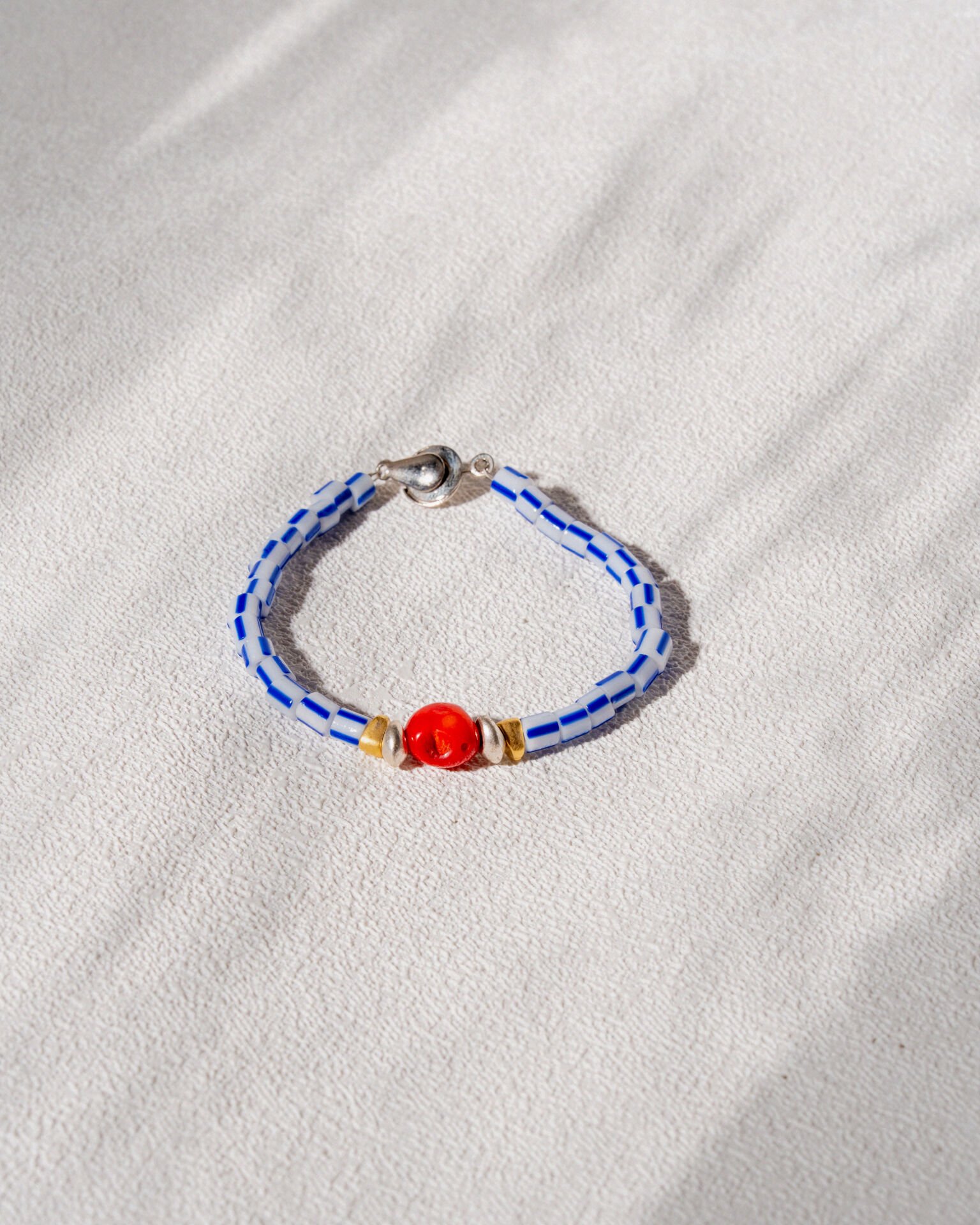 Doğal taş, cam boncuk, altın ve gümüş kaplama malzemeler kullanılmıştır.