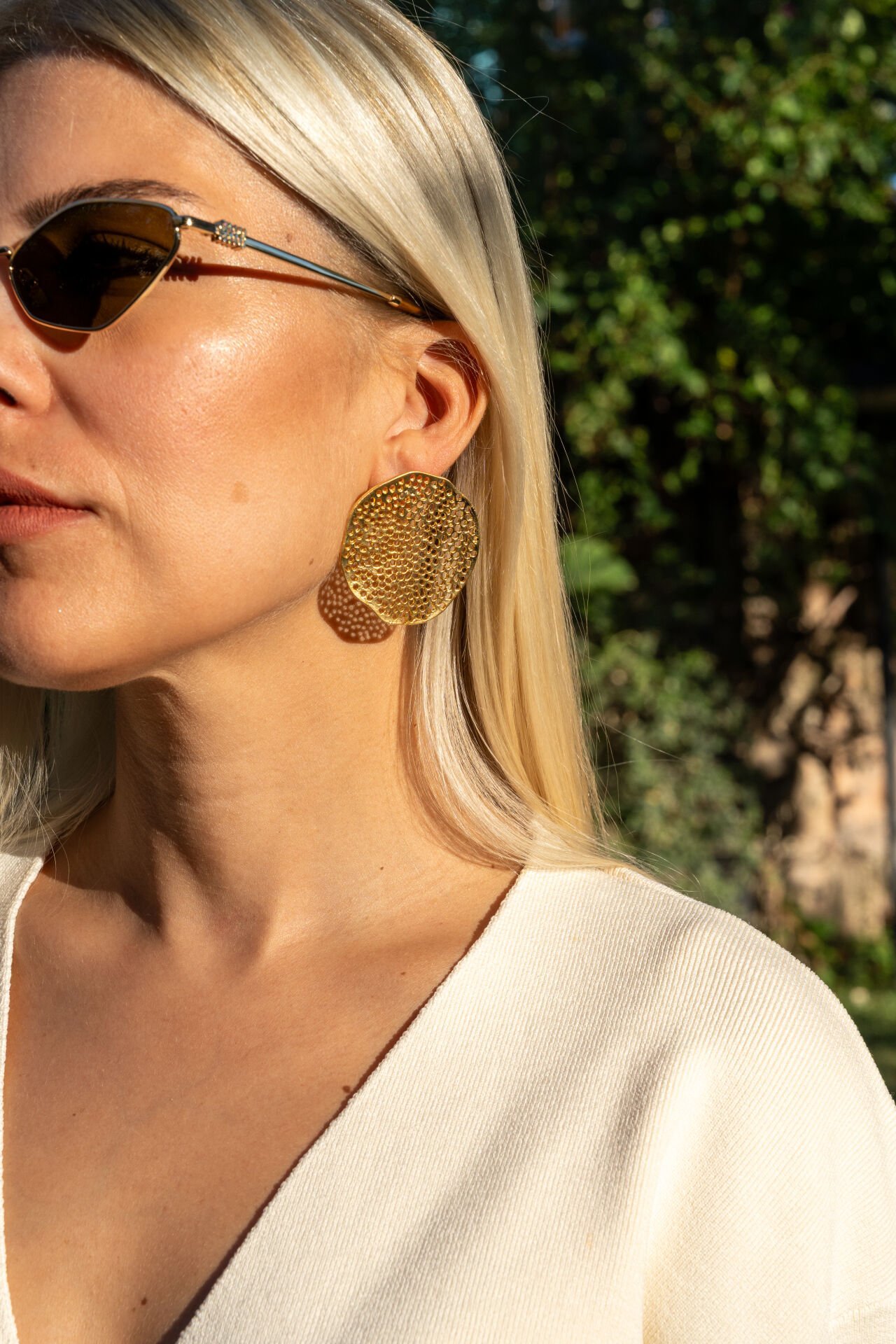 El yapımı ve altın kaplama, yuvarlak delikli küpe.